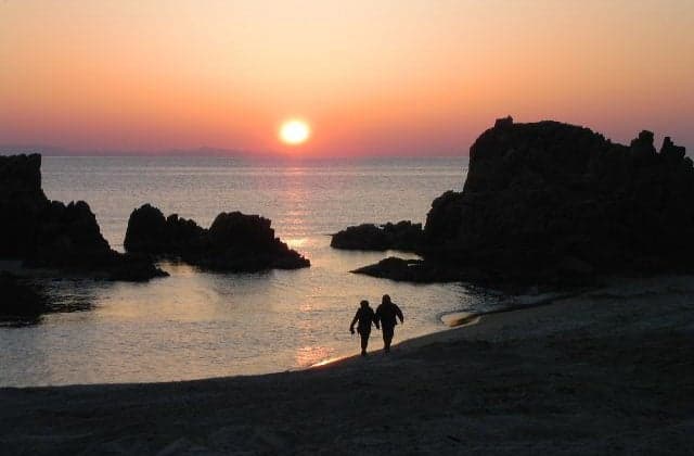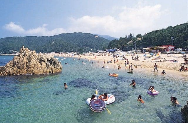 県内外から海水浴客が訪れる海水浴場。砂粒が細かくきらめく白い砂が特長。海外線を染める夕日など、風景の美しさにも定評がある。