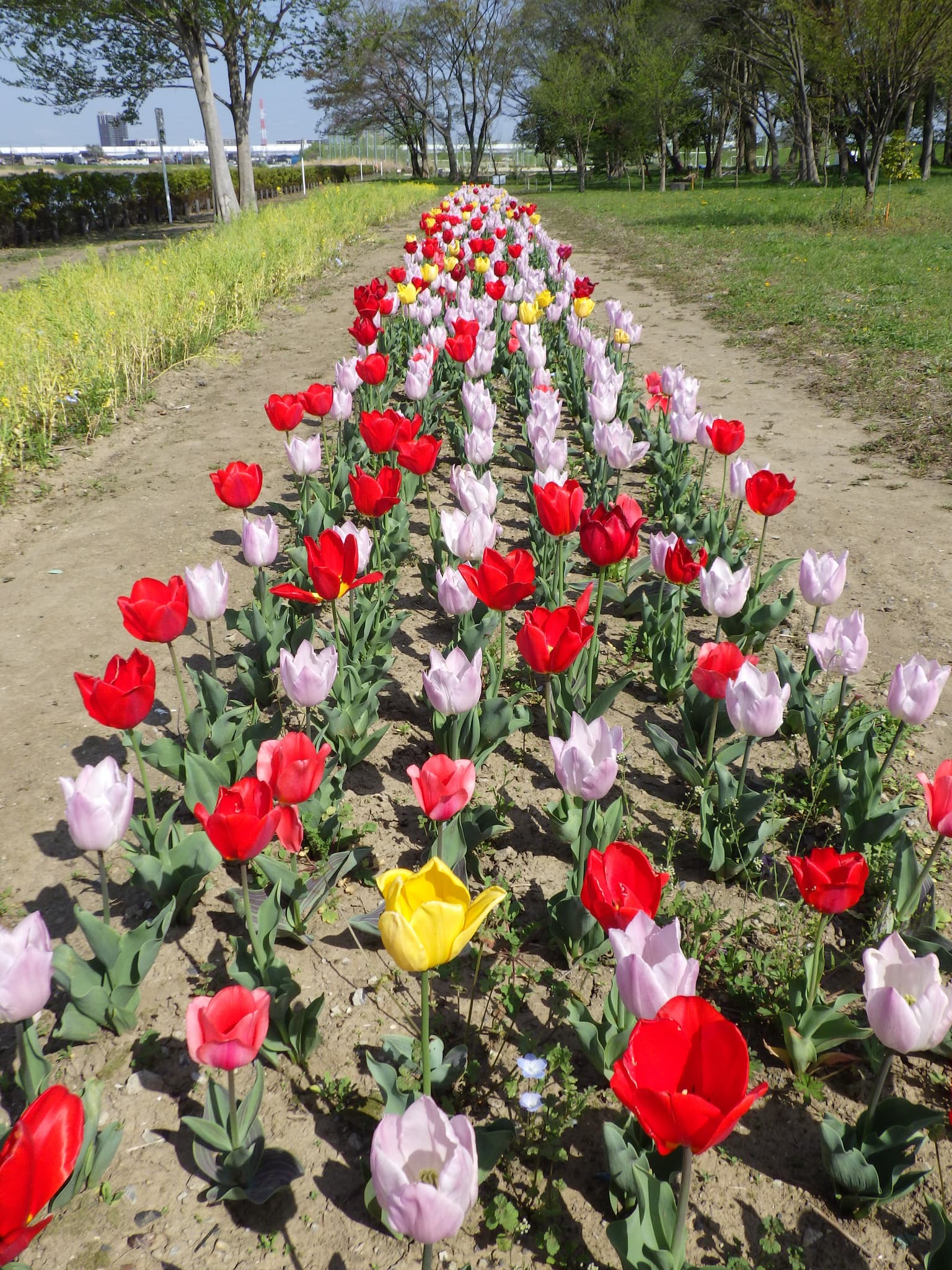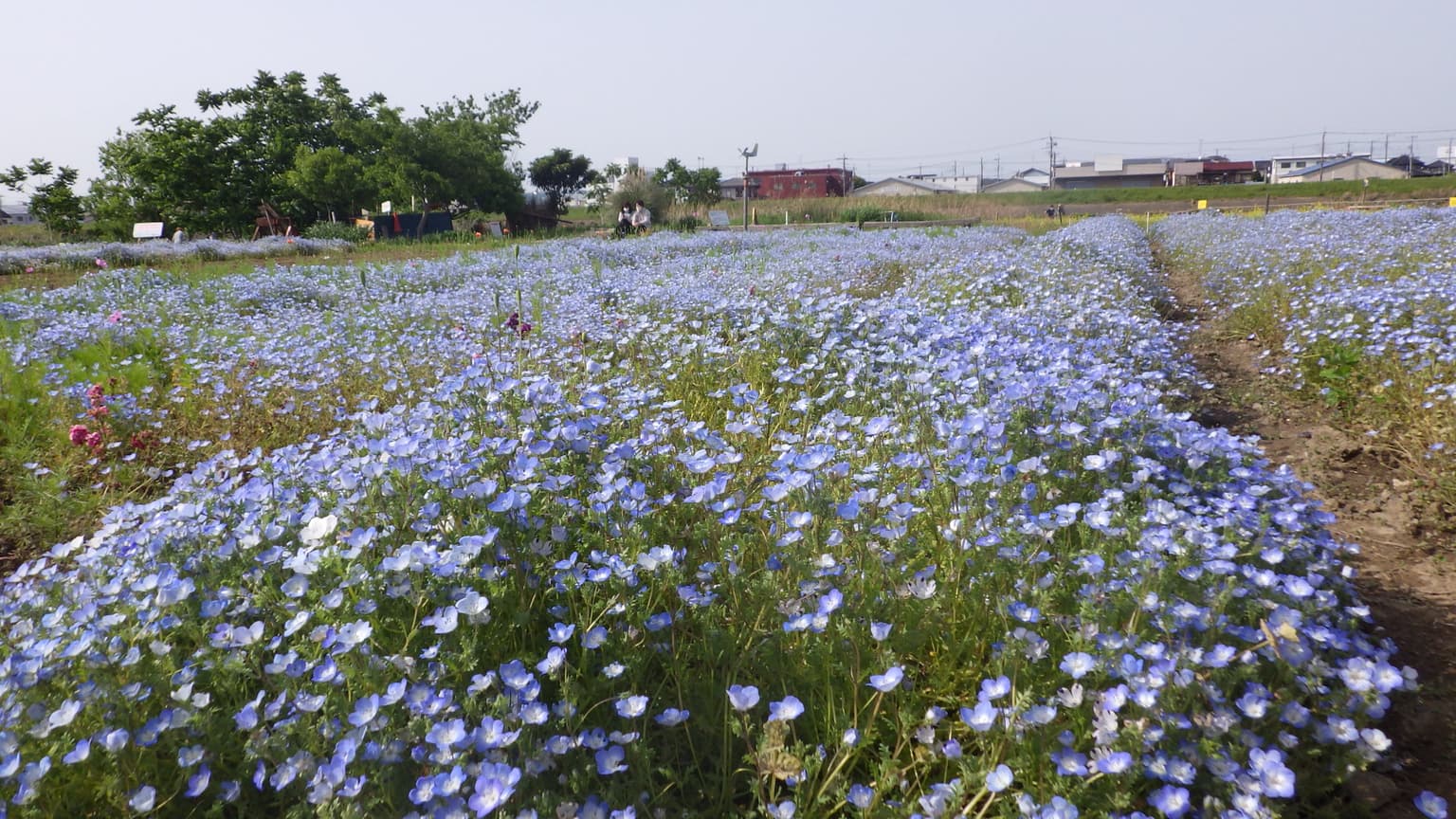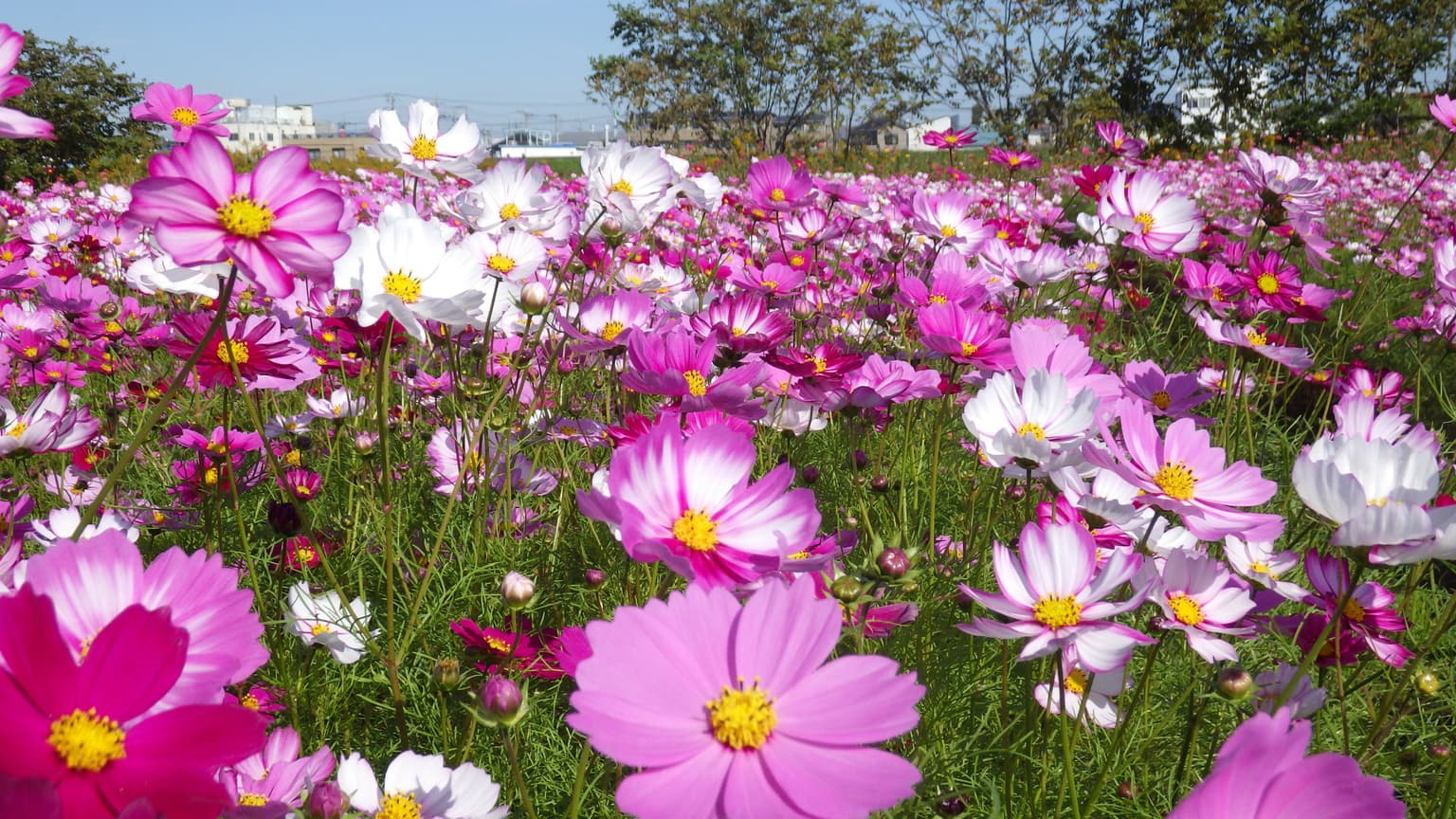 約1万3000平方メートルの中川河川敷に、春には花桃や菜の花、ネモフィラ、ストック、パンジー、秋にかけて彼岸花やコスモス、マリーゴールドなど四季折々の花が咲き、憩いの場として親しまれています。