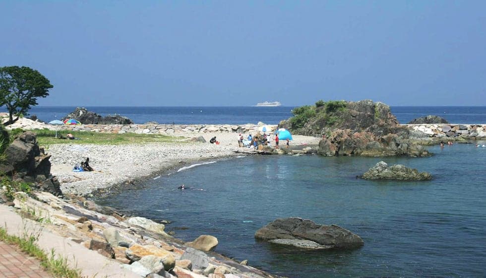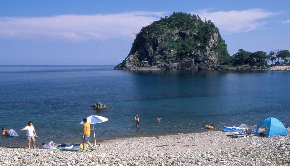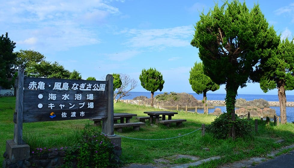 穏やかな海岸美が続く前浜海岸。巨岩「風島弁天」と「赤亀岩」を有する景勝地の公園に渚が広がっています。佐渡一周線からすぐの場所ながら、透明度の高い海中と美しい砂利浜の海水浴場は、プライベートビーチ気分が味わえる人気スポット。整備された公園内には、芝生のキャンプサイトもあります。