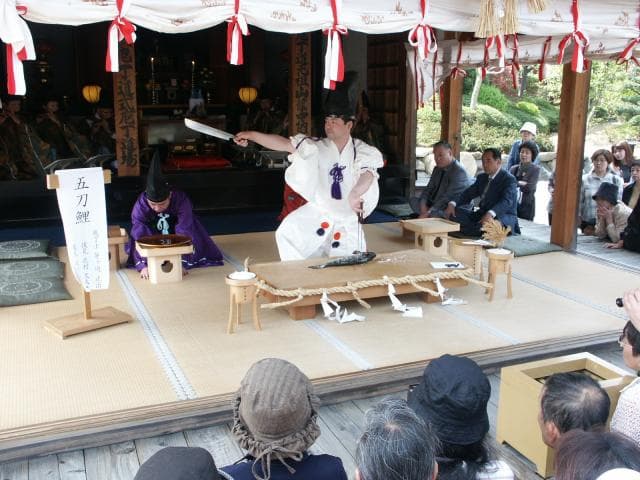 山蔭流庖丁式は古来宴席で当主が来賓を前に料理して見せたことに由来し、室町時代から続けられていると伝えられます。当日は、政朝を料理の元祖とした山蔭流の烏帽子・直衣姿の板前さん数人が、庖丁と真魚(マナ)ばしで生け造りを奉納する鮮やかなさばきぶりが観覧できます。
