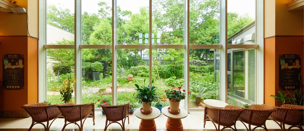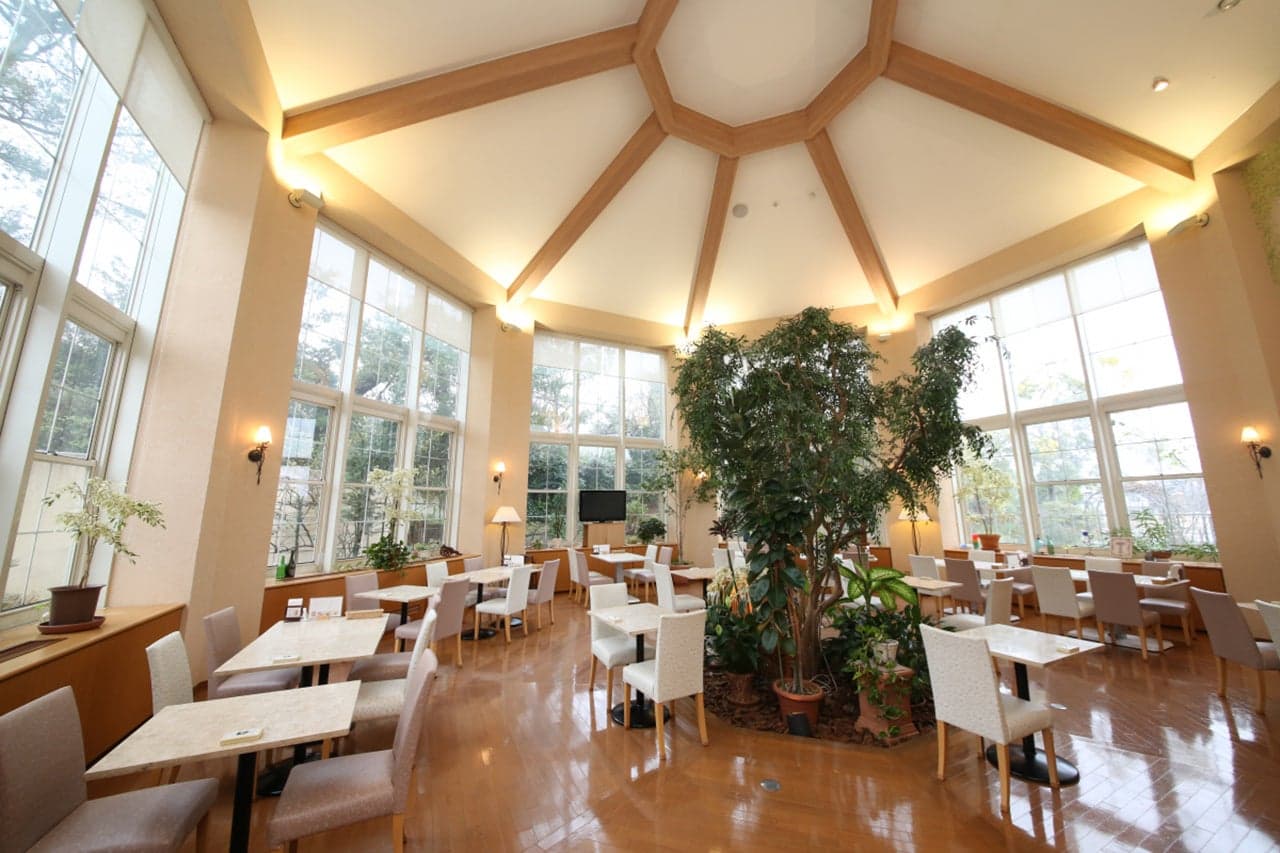秋葉山の麓に位置し、館内外ともに南欧風の雰囲気がただよいます。