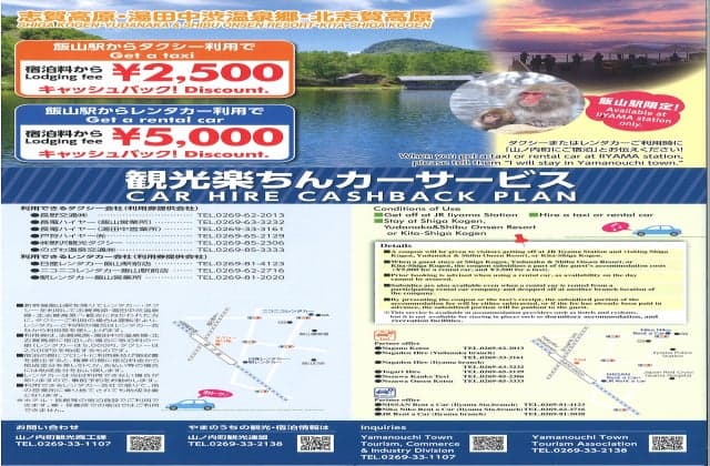 ■新幹線飯山駅を降りてレンタカー、タクシーを利用して志賀高原・湯田中渋温泉郷・北志賀高原へ観光に向かわれた方に、タクシーご利用の場合は運転手より、レンタカーご利用の場合はレンタカー会社から利用券を差し上げます。
