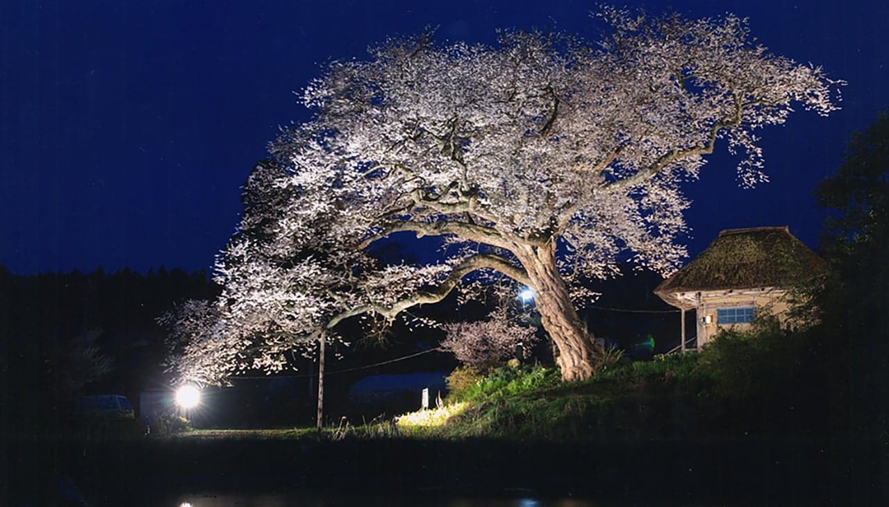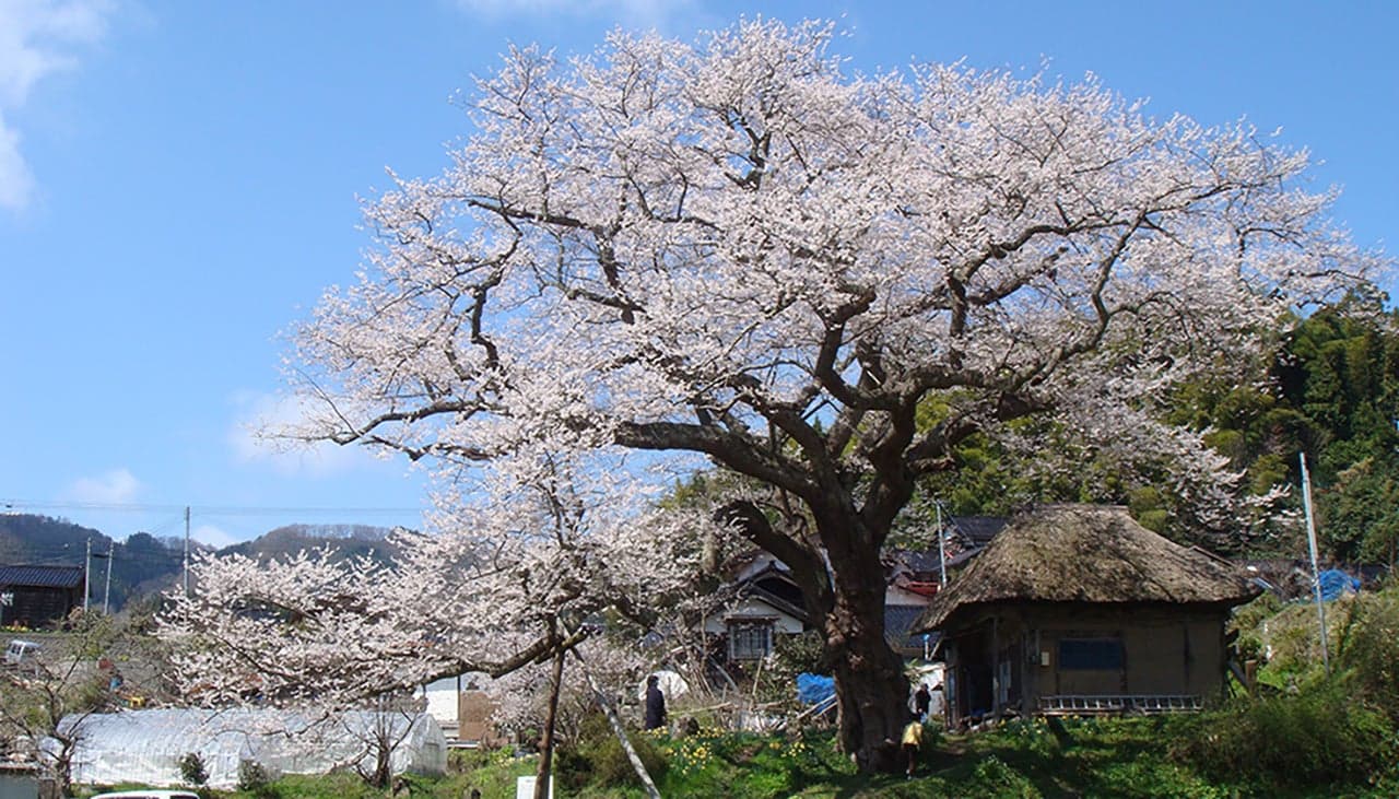 「大崎そばの会」で知られる羽茂大崎地区の桜の巨木。法乗坊跡地で茅葺屋根の建物に寄り添うように枝を拡げています。樹齢は250~260年と伝わり、根元周り6.9m、樹高21m、枝張りは東西南北ともに26mにおよびます。地元の人々からは「法乗坊の種蒔き桜」と呼ばれ、農作業の目安として親しまれています。