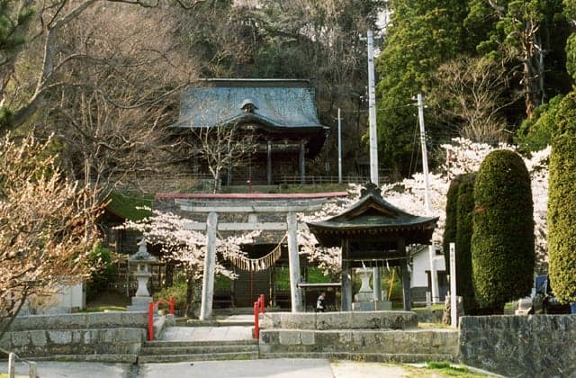 社殿は江戸時代中期に、完成・遷宮したもので、すべて信達二郡の氏子の協力により造営された。階下の石の鳥居はその記念に建てられたもので、東柱正面に文字が刻まれている。