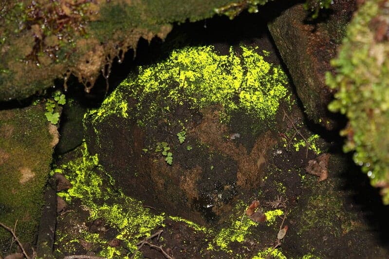 薄暗い洞穴の中で光が差しこむと黄緑色に光り、顔などで光線を遮ると見えなくなります。