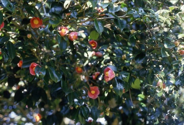 徳保八幡神社の社叢は、小規模ながら自然林が保存され、特にヤブツバキの群生地として知られており、「徳保の千本椿」と称されています。ヤブツバキは、暖帯の常緑広葉樹の代表樹種の1つで、九州から本州の海岸部や近くの山地に広く見られますが、その群生地が特に珠洲市に多いため、市花となっています。3?5月に開花します。