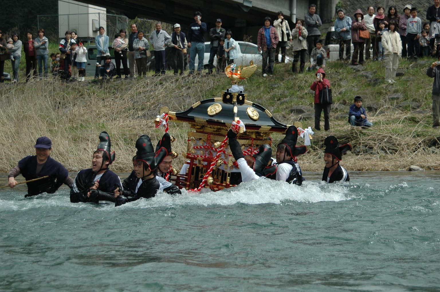重さ150kgにもなる神輿を担ぎ、激流の大屋川を渡る「川渡御(かわとぎょ)」は、この祭り最大の見どころで、腰の高さで神輿を支え、水を浴びながら進む姿は、他では見られない圧巻の光景です。