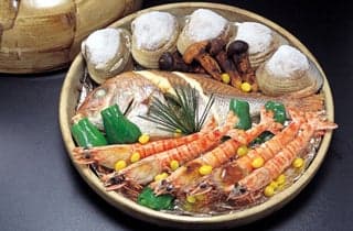 素焼きのほうろくの上に小石を並べ、その上に鯛・エビ・ほご・さざえ・はまぐりなどの新鮮な魚介類を色どりよく盛って焼く料理。うま味が逃げず、石が余分な水分を吸って、ほっくりと焼き上がる。 また、海賊料理とも呼ばれ来島水軍が戦勝の祝いに食べていたともいわれています。