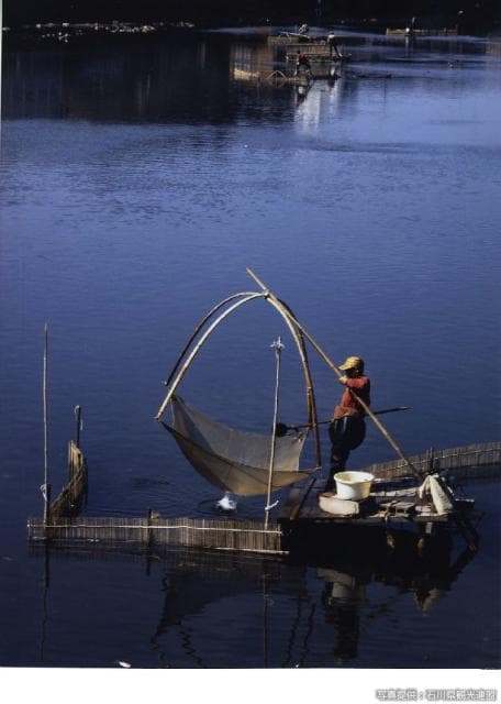 イサザは白魚に似た3~4cmほどのハゼ科の小魚。3月から5月にかけて,四手網を使いイサザをとる姿は春の風物詩となっている。