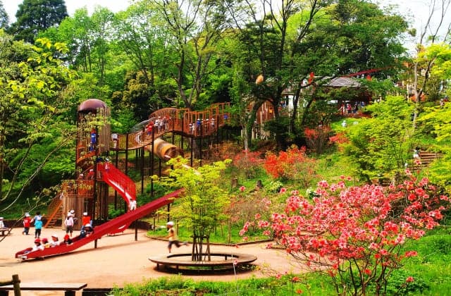 昭和の森は、県内でも有数の規模を誇る千葉市の総合公園です。施設内にはアスレチックやキャンプ場のほか散策路やサイクリングコースなども充実しており、一日中楽しめます。展望台(海抜101m)からは、九十九里平野と太平洋の水平線が一望できます。