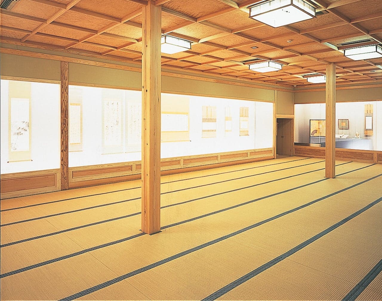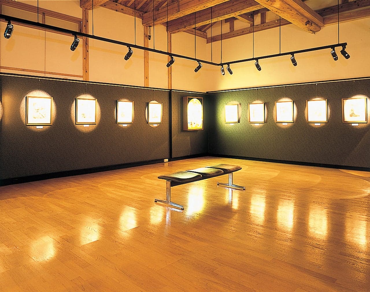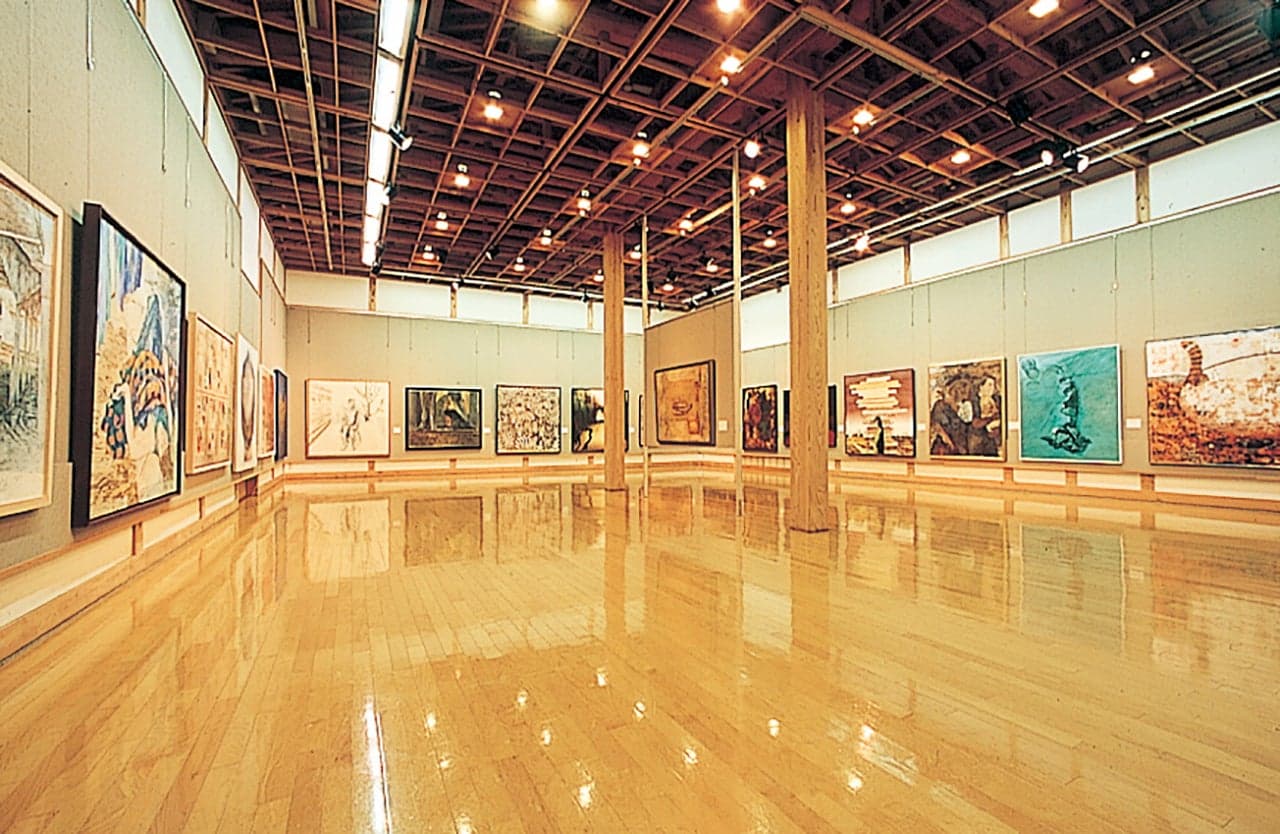 1,500坪の焼鮒公園内にある純日本建築の雪梁舎美術館。美術館としてはめずらしい86畳敷きの畳の展示室、天井高く手斧ハツリの梁のわたる展示室があり、年間を通して様々な企画展を開催しております。