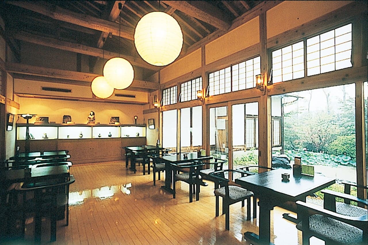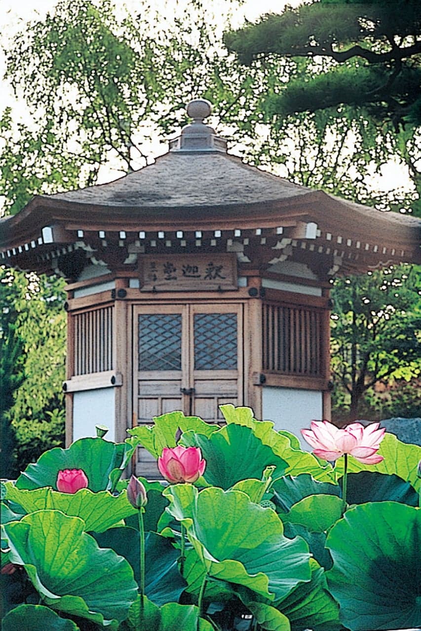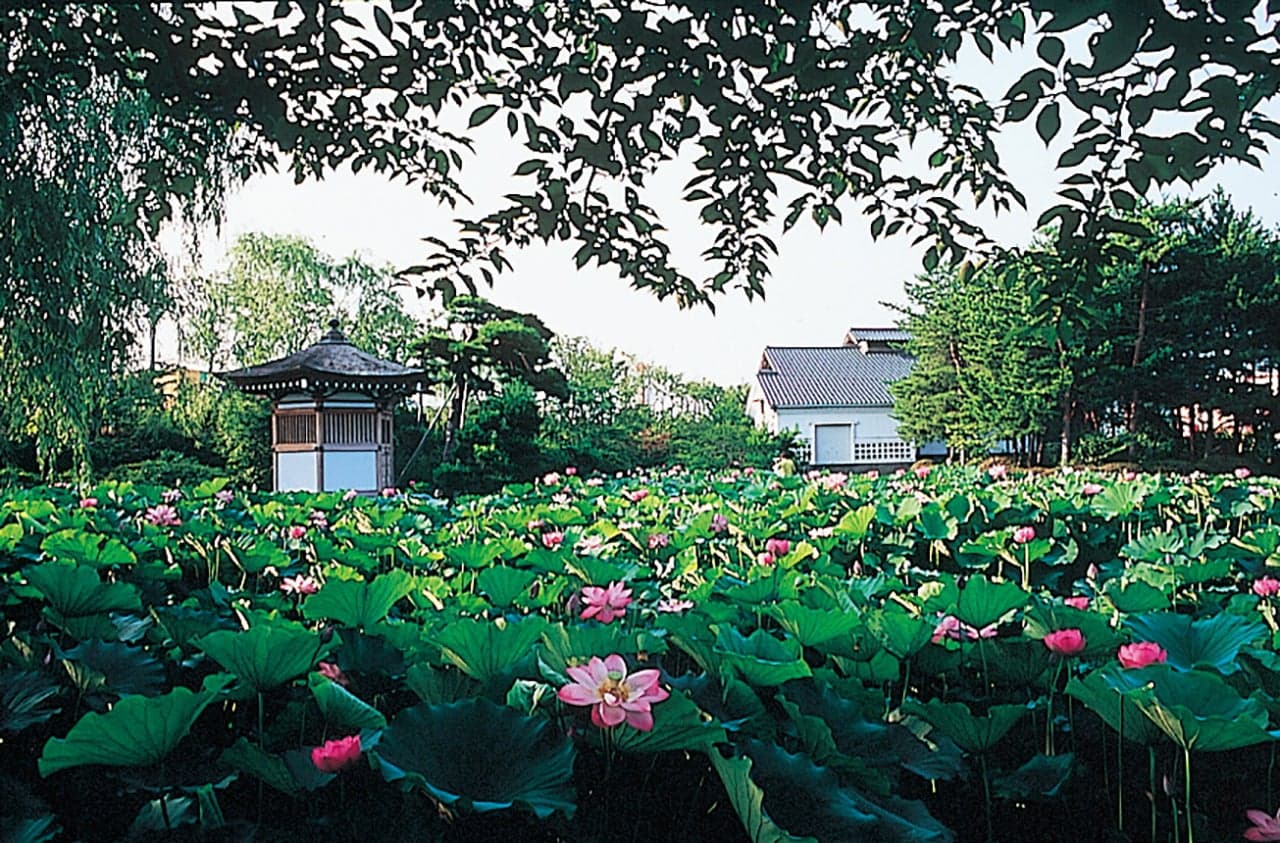 館を取り巻く日本庭園では、四季折々の花木が安らぎを与え、夏には大輪の蓮の花が池を覆いつくす姿をご覧いただけます。