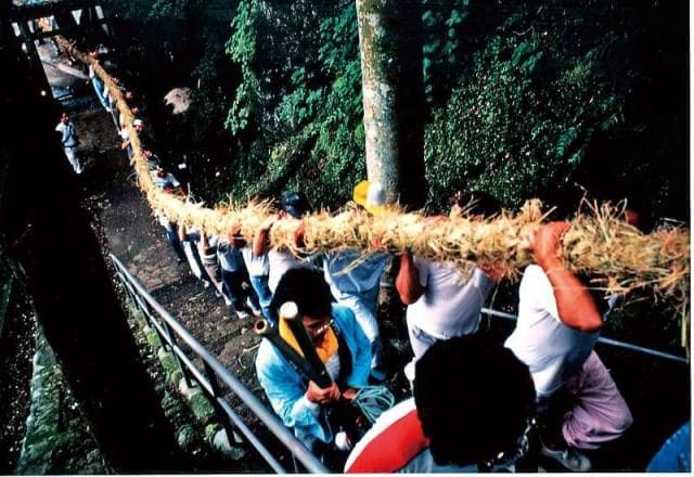 仁科港のすぐ山手にあるスサノオノミコトを祀った神社。毎年7月16日に長さ80m・太さ30cmの大注連縄が奉納される。