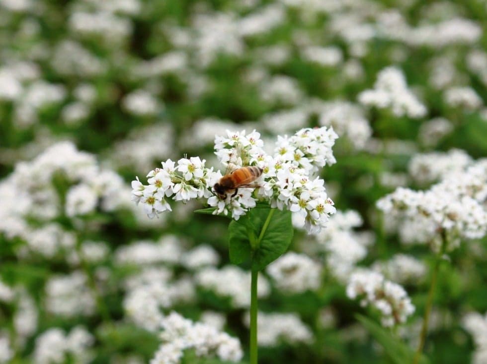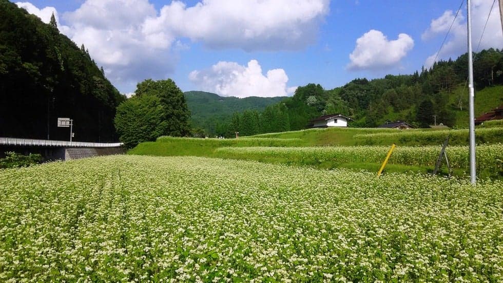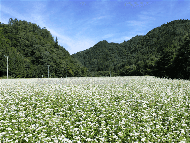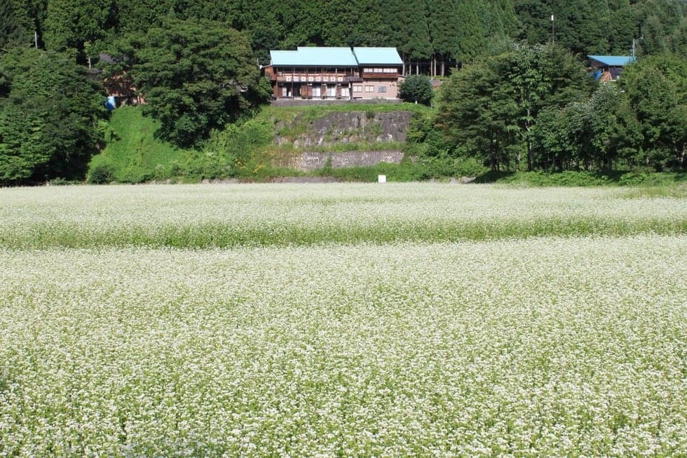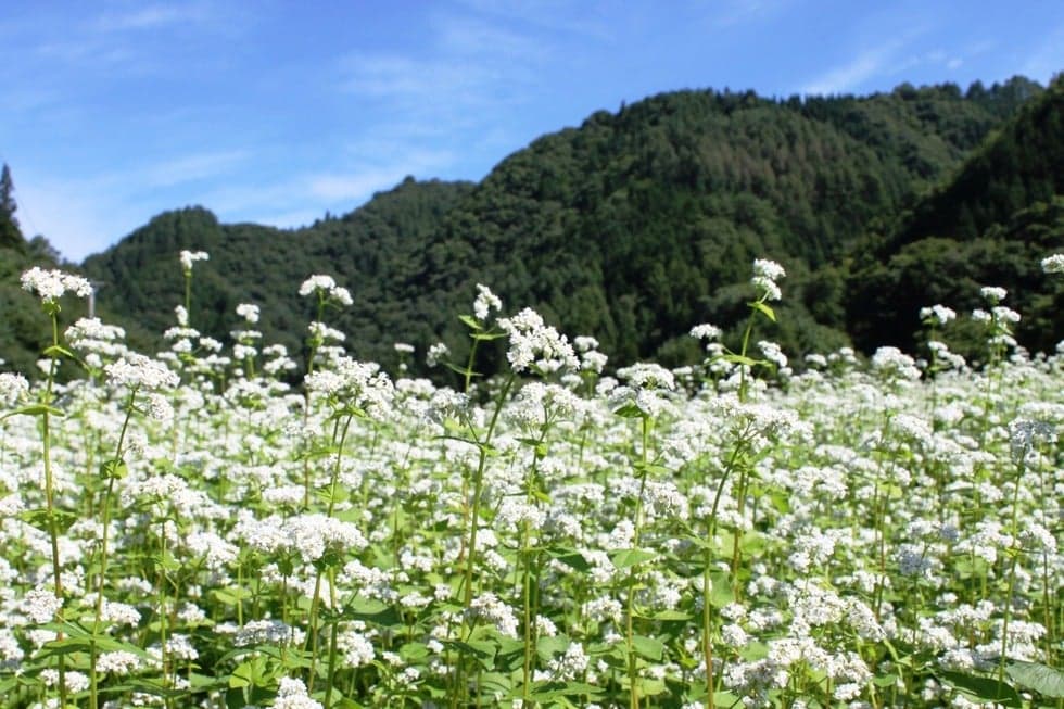 白く小さな花がじゅうたんのように辺り一面に広がります。実の収穫が終わると町内のそば店にて新そばが味わえます。