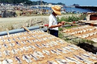 初夏、この島の特産品イカの一夜干しを作る風景が見られる。