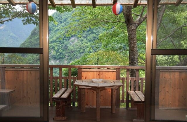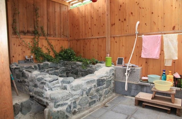 杉、桧、高野槙 を使い分けている、木の香りいっぱいの宿。手作りの露天岩風呂あり。