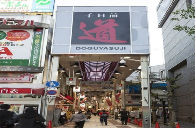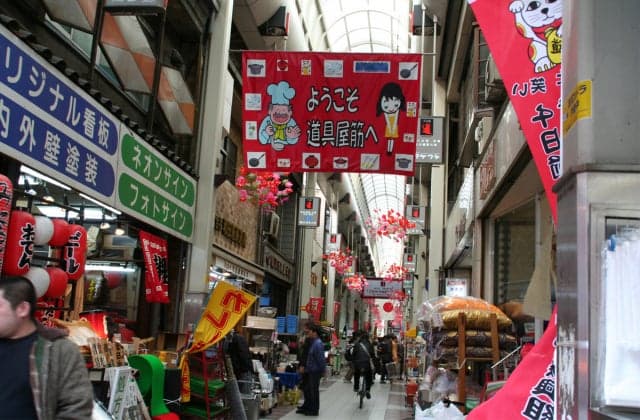 料理道具・厨房用品のすべてが揃う専門店が軒を連ねている、全長150mの商店街。「道具の日」の10月9日には「道具屋筋まつり」が行われ、いろいろな道具を安く販売。