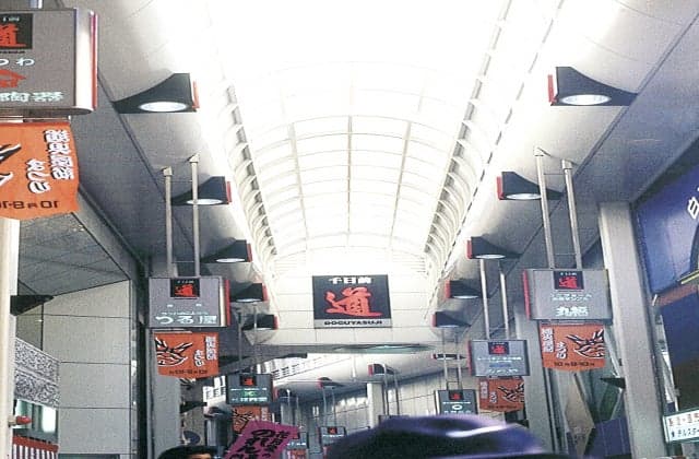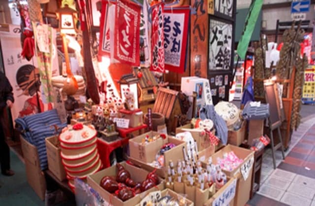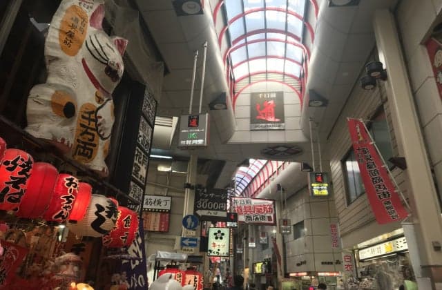 千日前道具屋筋商店街は、料理道具・厨房道具のすべてが揃う専門店が軒を連ねる商店街。大阪は「天下の台所」と呼ばれ、こころと技を鍛えた板前さんが大勢働いているところ。道具屋筋にはそのプロの使い勝手にふさわしい道具を揃える店が集まっている。もとは明治15年(1882)、法善寺の千日前から四天王寺のお大師さんや今宮戎神社への参道として、古道具屋や雑貨商が軒を連ねたのが始まり。大正時代になって、次第に問屋・製造業の専門店として発展し、戦後の昭和45年(1970)には、アーケードが建ち、現在の全長150mの商店街へ。「道具の日」の10月9日には、「道具屋筋まつり」が行われ、いろいろな道具を安く販売。また、近年では、たこ焼きの実演販売や食品サンプルづくり体験の実施で、他地方からの修学旅行生に大人気だとか。