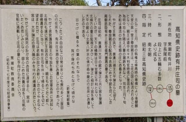 墓は全部五輪石からなっているが、これは尊良親王が都へ還幸された後、送り届けられたものという。(高知県指定史跡)