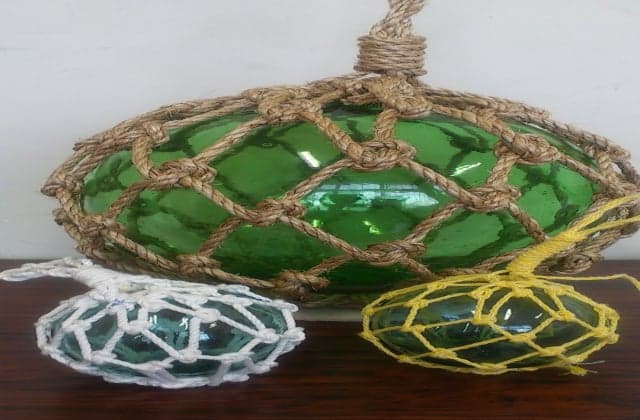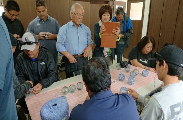 昔は漁に使っており、すべて漁師の手作りだったガラス浮き玉の保護網を編む体験をします。