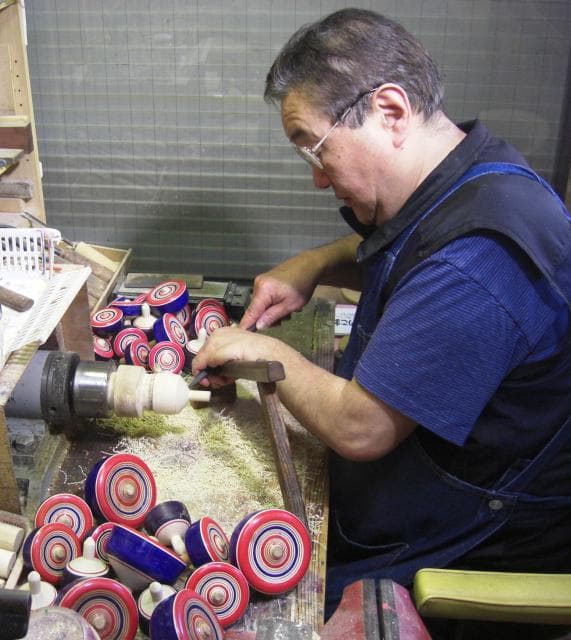 玩具コマ・置物コマ。どっしりした形と、紺と赤のろくろ模様が美しい。