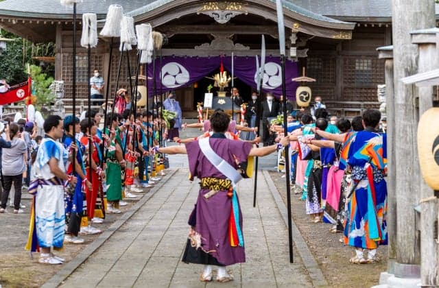 天保10年(1839年)に始まったと伝承され,2列の奴が高々とシャンガと呼ばれる毛槍を振り、一斉に槍を相手に放り渡す所作など、勇壮にして機能美あふれる道中絵巻です。毎年9月15日、正院キリコ祭りの際に行われます。