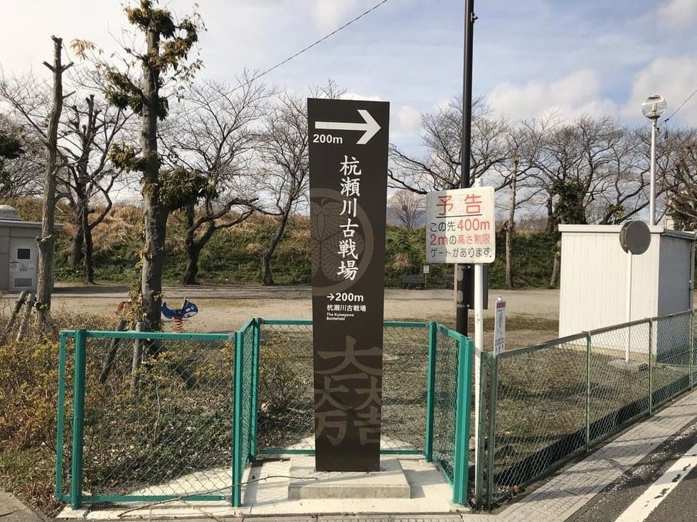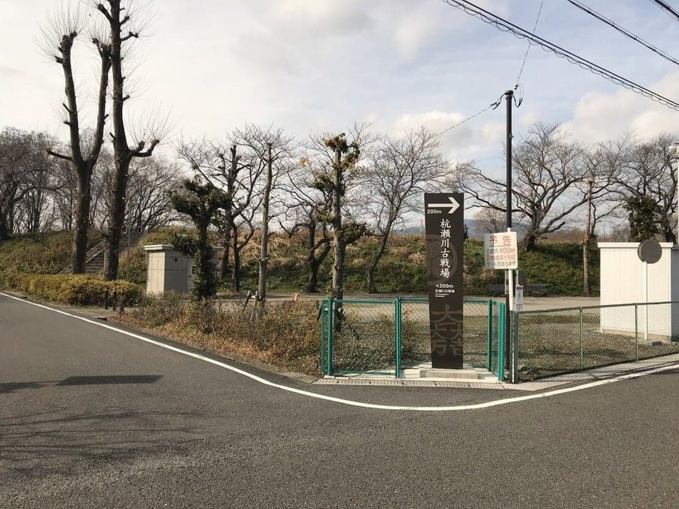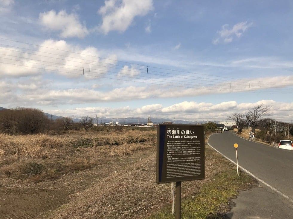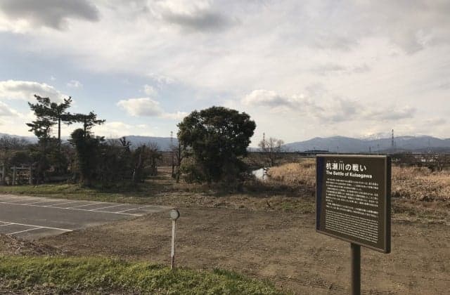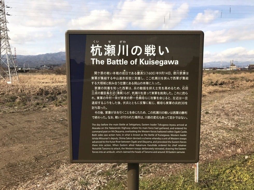 慶長5年(1600年)9月14日、大垣城を出陣した西軍「島左近・蒲生備中(がもうびっちゅう)」ら軍勢約500人は、一隊を伏せて杭瀬川を渡り、東軍「中村一栄」隊を挑発、出陣してきたところを偽りの退去で誘い込み、これを打ち破りました。杭瀬川の広大な河川敷が、往時を偲ばせます。赤坂には、杭瀬川の戦いで討死した中村隊の猛者「野一色頼母(のいっしきたのも)」を葬った兜塚も残っています。なお、戦いの行われた場所は、川筋の変化もあって定かではありません。