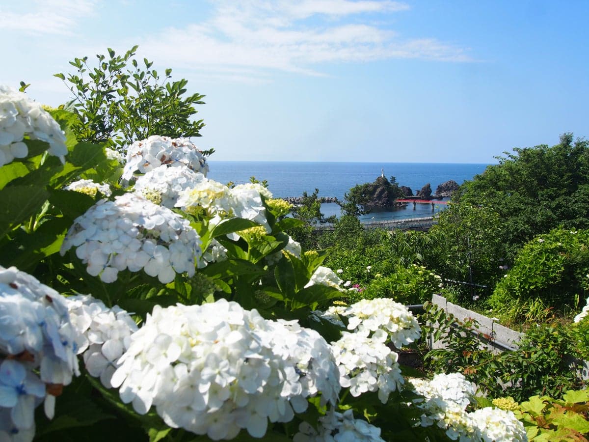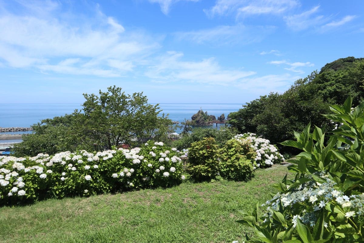 元々この地で民宿を営んでいた大王武さんが、趣味であじさいを植栽したのがはじまり。年々、株数を増やしていき、今では約1,500平方mの園内に、約1,500株35種類のアジサイが咲き競います。ベンチとテーブルが置かれた頂上部からは、弁天岩と日本海を見わたせる絶好のロケーション。