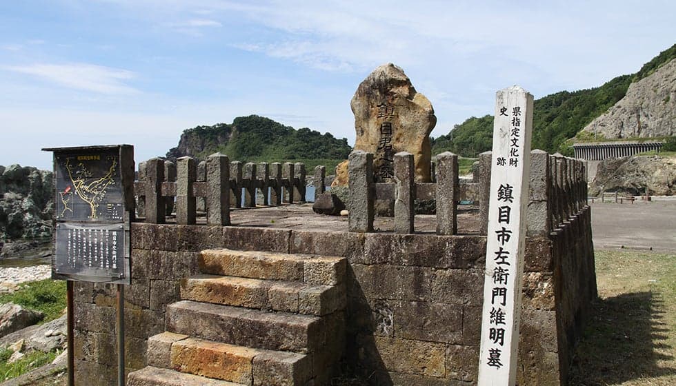 鎮目市左衛門は、桃山~江戸時代初期の武将。関ケ原の戦いでは徳川家臣として活躍。1618年に佐渡奉行に着任後、さまざまな施策を実行し、金銀山の復興に尽力した名奉行として名を残しました。お墓はその業績をたたえ、1845年に建てられたものです。奇観「弁慶のはさみ岩」と佐渡金銀山関連資産の「吹上海岸石切場跡」が隣接しています。