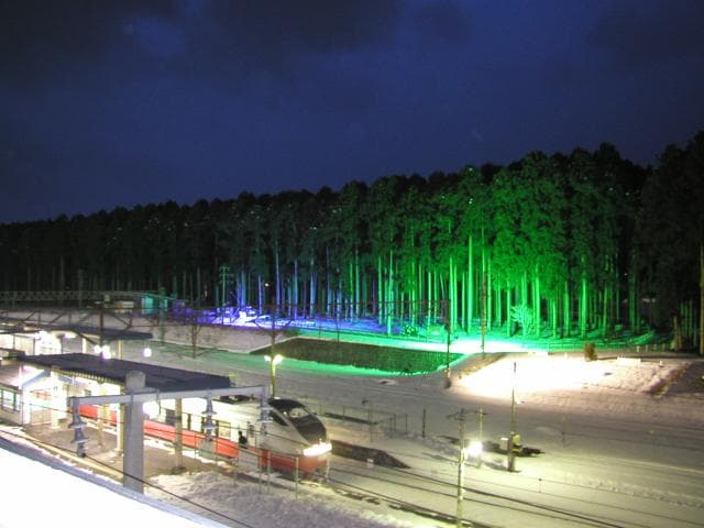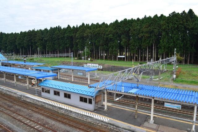 野辺地駅のホーム西側に2kmにわたって続く約700本の杉林。明治26年に、日本初の林学博士である本多静六氏の進言で誕生したこの杉林は、豪雪地である町の線路を守るために植林された日本初の防雪林で、鉄道記念物に指定されています。