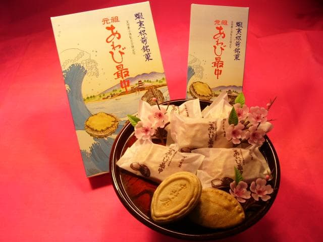当店商品の、あわび最中は最高級の小豆を原料に製餡され中に入っている餅も当店特有の製法貝柱に見立てて製造されております。また、桜酒を使った「花の松前」はめずらしいピンク色をした桜の香漂うカステラでなど、松前の香を形にしたお菓子でお土産には最適の逸品です。