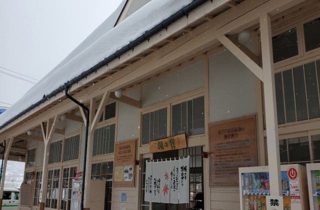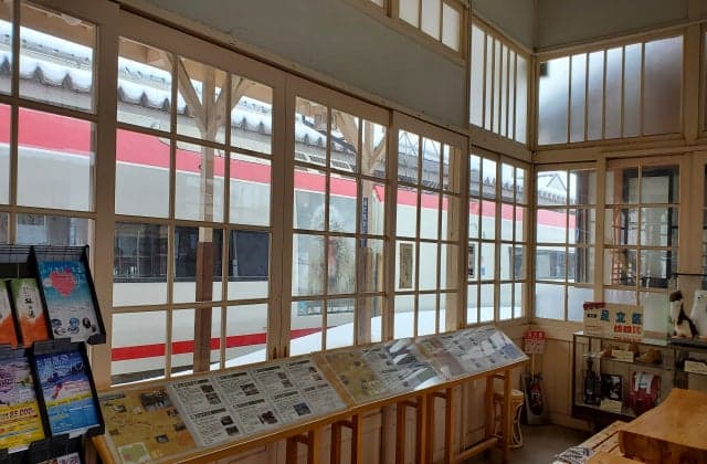 南北棟、切妻造、鉄板茸の木造平屋一部2階建てで、東、南及びプラットホーム側の3面に吹き放ちの下屋を廻す。正面待合室出入口上部の軒を切り上げて切妻破風を見せ、壁面はスティクスタイル風に仕上げる。現在は住民や観光客が利用する交流施設としても活用。