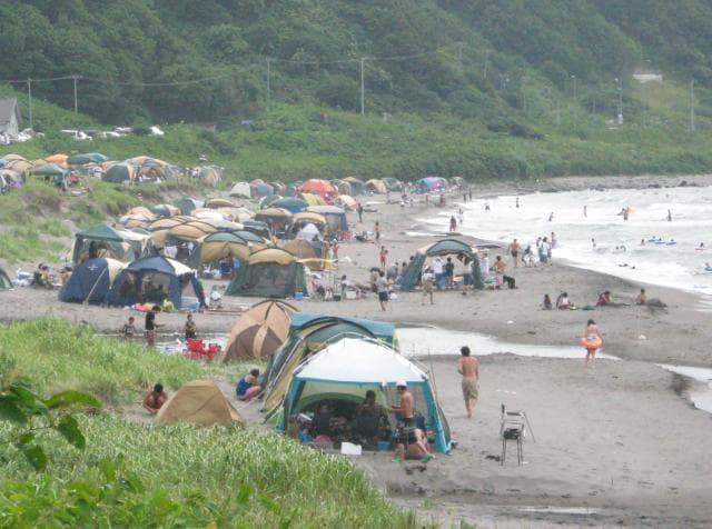キャンプサイトは砂浜や草地。積丹ブルーの海を、そして美しい夕日を満喫できます。海が近いので海水浴にも便利。遠くには神威岬も見えます。