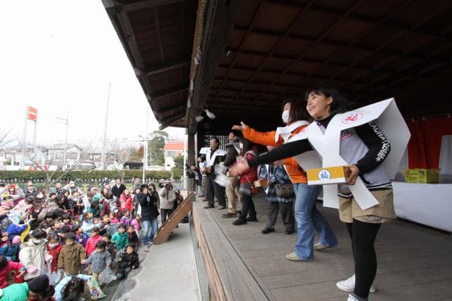 「鬼は外!福は内!」豆をまき、年の数だけ食べて、1年の無病息災を願います。会場では、かるた大会や紙芝居、竹馬や昔のあそび、あたたかいお汁粉