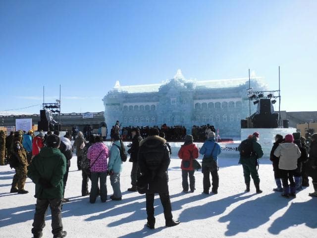 天然氷で作られたメインステージのほか、大小数10基の氷像が会場内に立ち並びます。楽しいイベントも開催されるほか、地元紋別の特産品の味覚市コーナーも軒を連ね、カニやホタテなどの海産物をバーベキューで楽しむこともできます。ライトアップされた夜の会場では、昼間の雰囲気とは異なり幻想的な七色に光輝く氷像が見る人を魅了します。