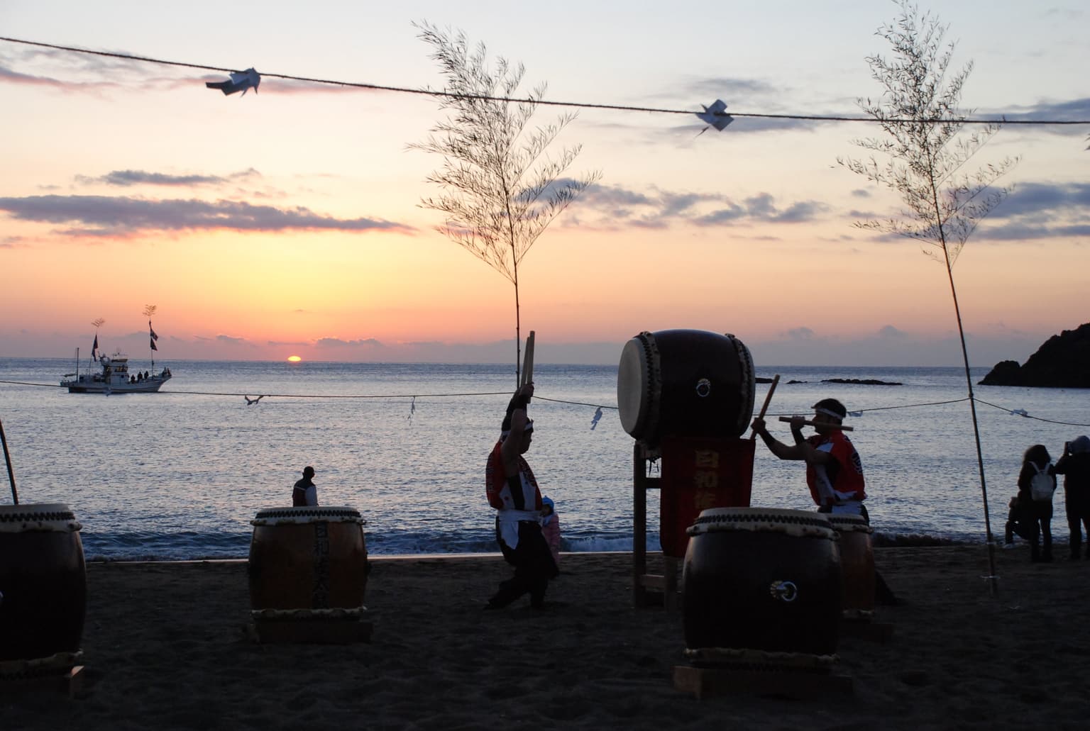 ウミガメが来る海岸として有名な大浜海岸では、初日の出スポットとしても名高く、元日の早朝には大勢の人で賑わいます。白砂の海岸が美しい景勝地として知られ、運が良ければ、水平線にかかる太陽がだるまのように歪む「だるま朝日」がみえることもあります。日の出とともに「ひわさ冬祭り」が開催され、日和佐太鼓創作会による和太鼓の演奏も楽しめます。また、隣接する日和佐八幡神社では初詣に来られた方に福餅をお裾分け※「ひわさ冬祭り」は状況により中止になる場合があります