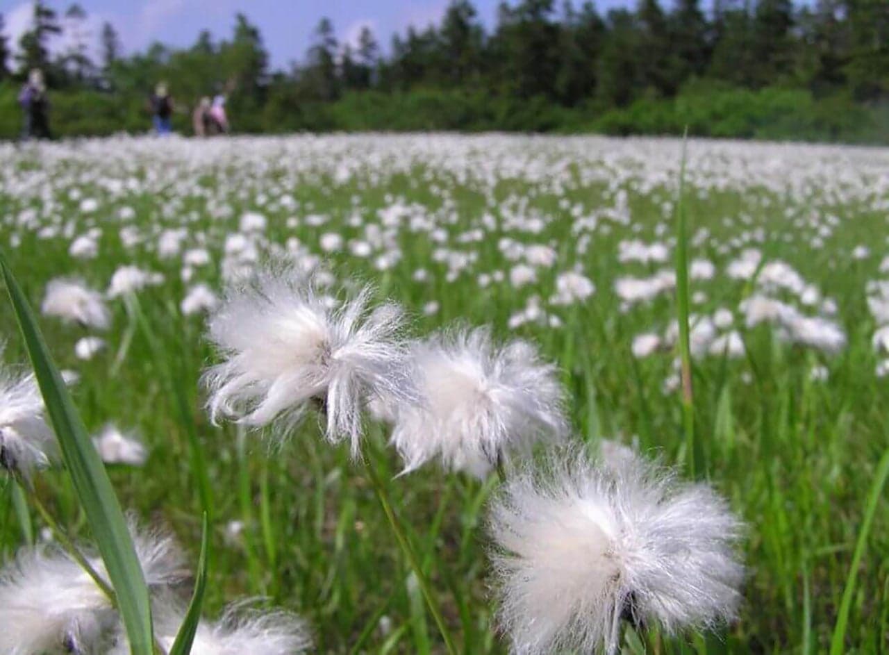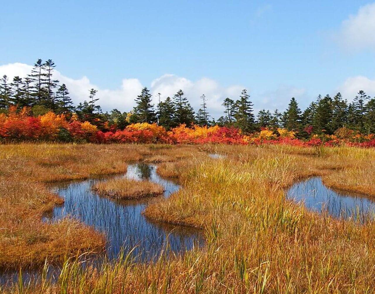 雪解け後の短い夏にはワタスゲが風に揺れる姿が、秋にはベニサラサドウダンの紅葉と青空が、池塘に映り込む光景を見ることができます。
