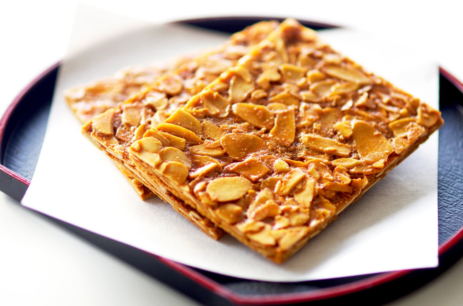 「あかまつせんべい」は、日本の道百選にも選ばれた国道5号線、七飯町の「赤松並木」をモチーフとしたお菓子です。アーモンドがぎっしり敷き詰められたおせんべいは、赤松の樹皮をイメージしており、1枚1枚手作りで無添加の焼き菓子です。