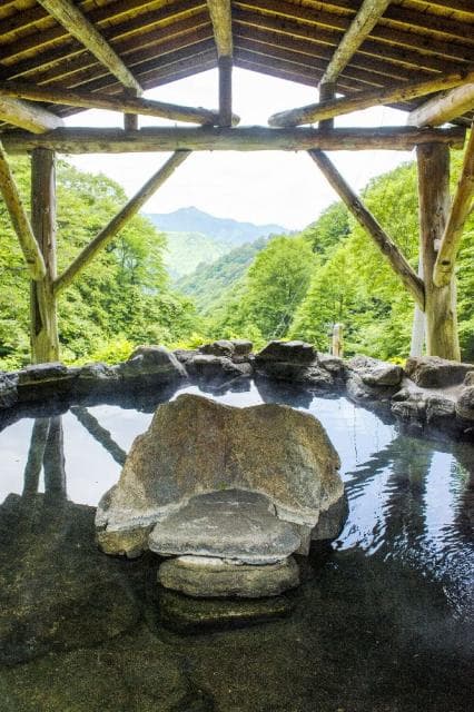 天元台に向かうロープウェイから見える山の中にある一軒宿。標高1126mの秘湯ならではの天然自噴自家源泉、5か所の露天風呂が人気。