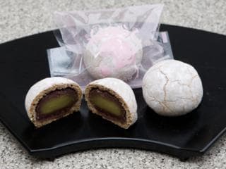 筑西市優良産品推奨品。 麦こがしを使用した生地に小豆餡に栗を包み、粉糖を手粉として包み上げオーブンにて焼き上げました。麦こがしの香ばしさと生地のさくさくした食感が後を引きます。