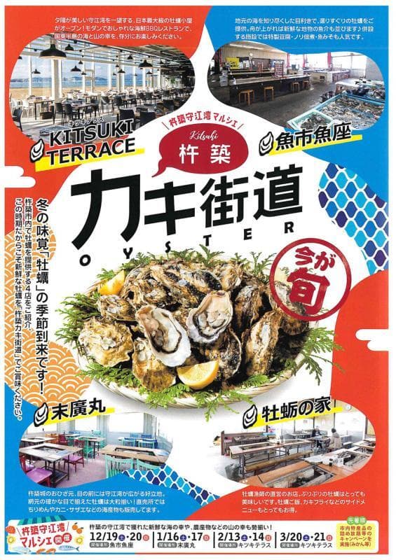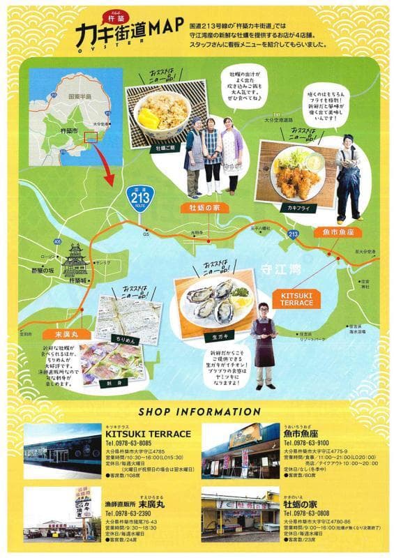 杵築市の国道213号沿いにある飲食店では、守江湾産の新鮮な牡蠣を提供する飲食店が4店舗点在し、「杵築カキ街道」と呼ばれています。