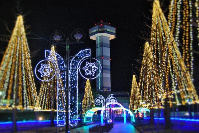 木曽三川公園センターは中央水郷地区の中心に位置し、木曽三川を一望できる展望タワーをシンボルとして、春はチューリップが園内を彩るチューリップ祭、そして冬は光り輝くイルミネーションで知られています。毎年開催される冬の光物語では、広大な公園を覆うイルミネーションの広さと高さ、ダイナミックな光の演出が見どころです。華やかな光が冬の夜空に輝き、高さ65mの展望タワーからは、幻想的で美しく光が一望できます。昼間とは全く違った幻想的な風景を楽しみに行ってみましょう。