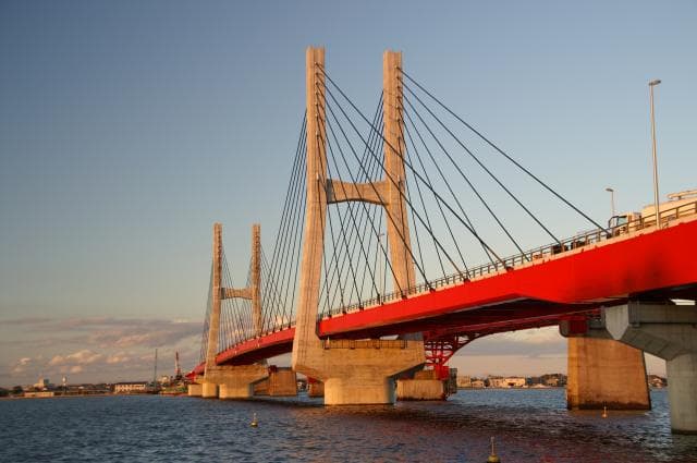 銚子大橋は、利根川に架かり銚子市と茨城県神栖市を結ぶ全長約1.5Kmの橋です。昭和37年(1962年)に開通し、千葉、茨城をつなぐ橋として使われていましたが、老朽化のため、平成16年から架け替え工事が行われ、平成24年度に完了しました。橋の中央から眺めた太平洋や利根川河口の景観は素晴らしく特に夜明けと太陽は雄大そのものです。
