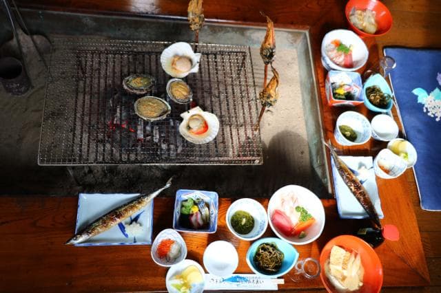 宿のご主人は定置網の大謀。食卓には素材を知り尽くした海の男の作る、豪快な磯料理が並びます。漁の道具が並んだ雰囲気たっぷりの囲炉裏部屋で、じっくり焼いた魚介と日本酒を傾けながらの炉端焼きもおすすめ。炉端焼きは、予約の時に予算と人数を告げてください。