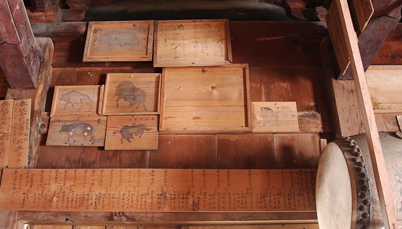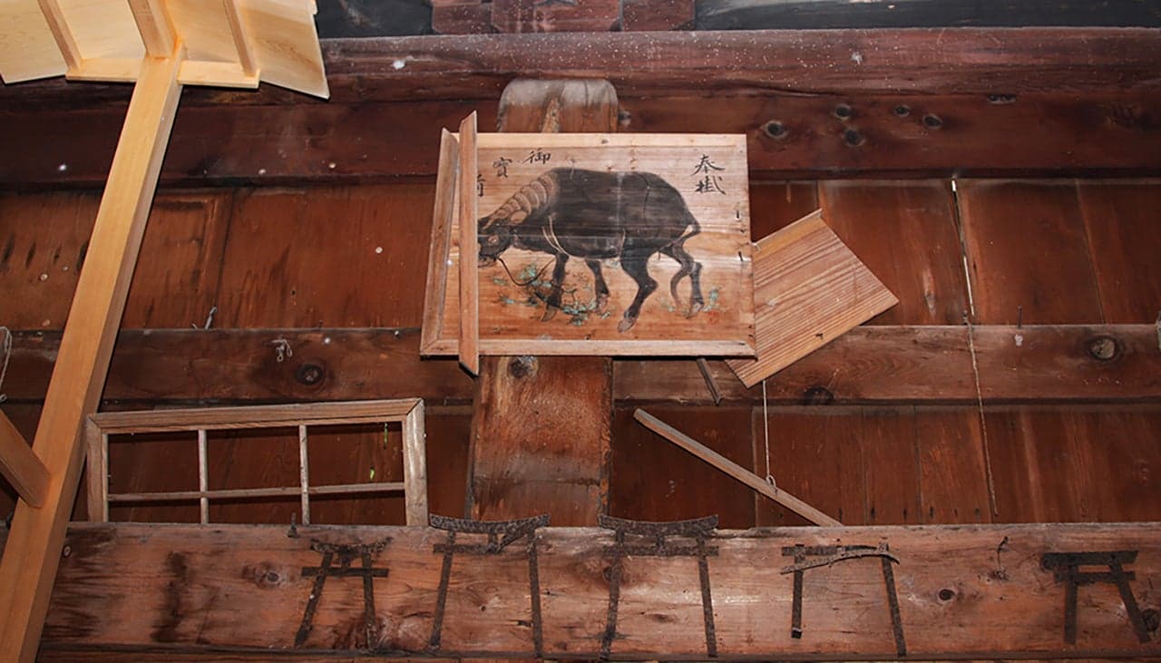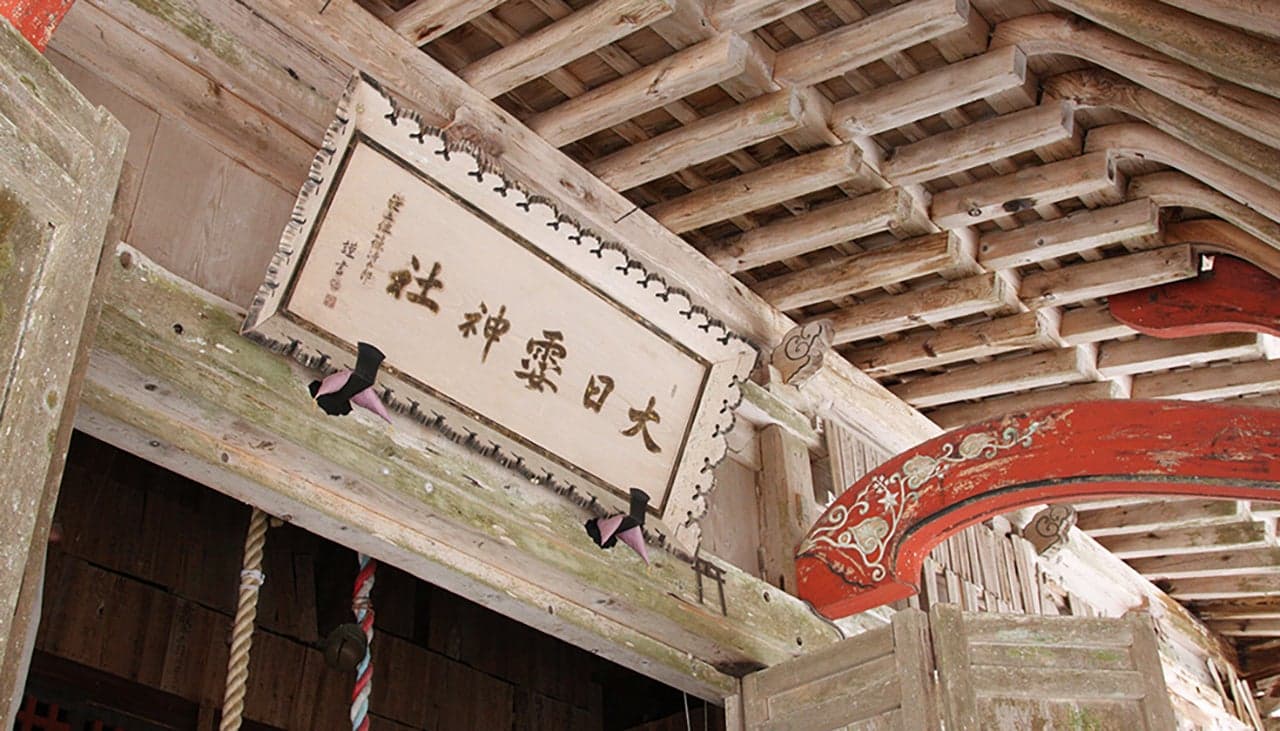 1490年の創建とされる「大日霊(おおひるめ)神社」の拝殿。現在の建物(県の有形文化財)は1718年の再建と伝わります。堂内には、木食清眼の作とされる「大日如来坐像」(市の有形文化財)を安置。牛の守護神として篤い信仰を集めており、古くは全島から牛飼い人が牛とともに徒歩で訪れました。“牛の絵馬”“牛のわらじ”が多数奉納されています。