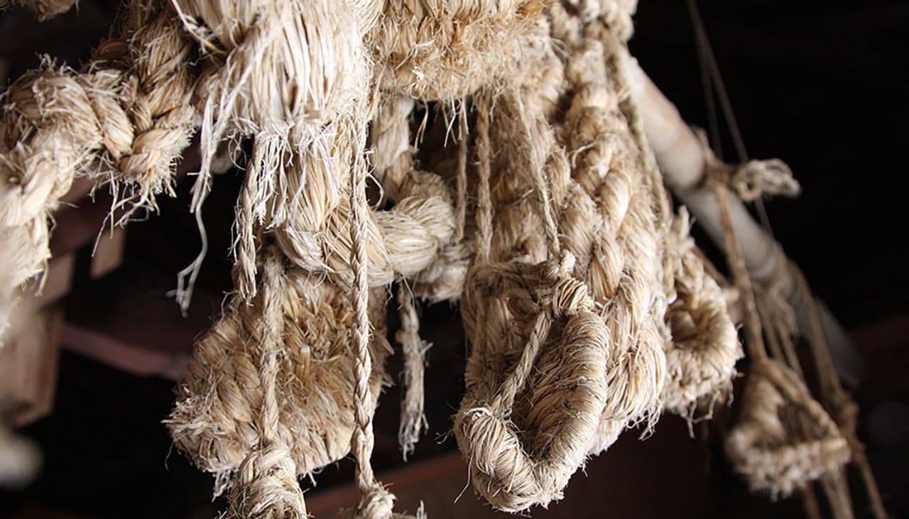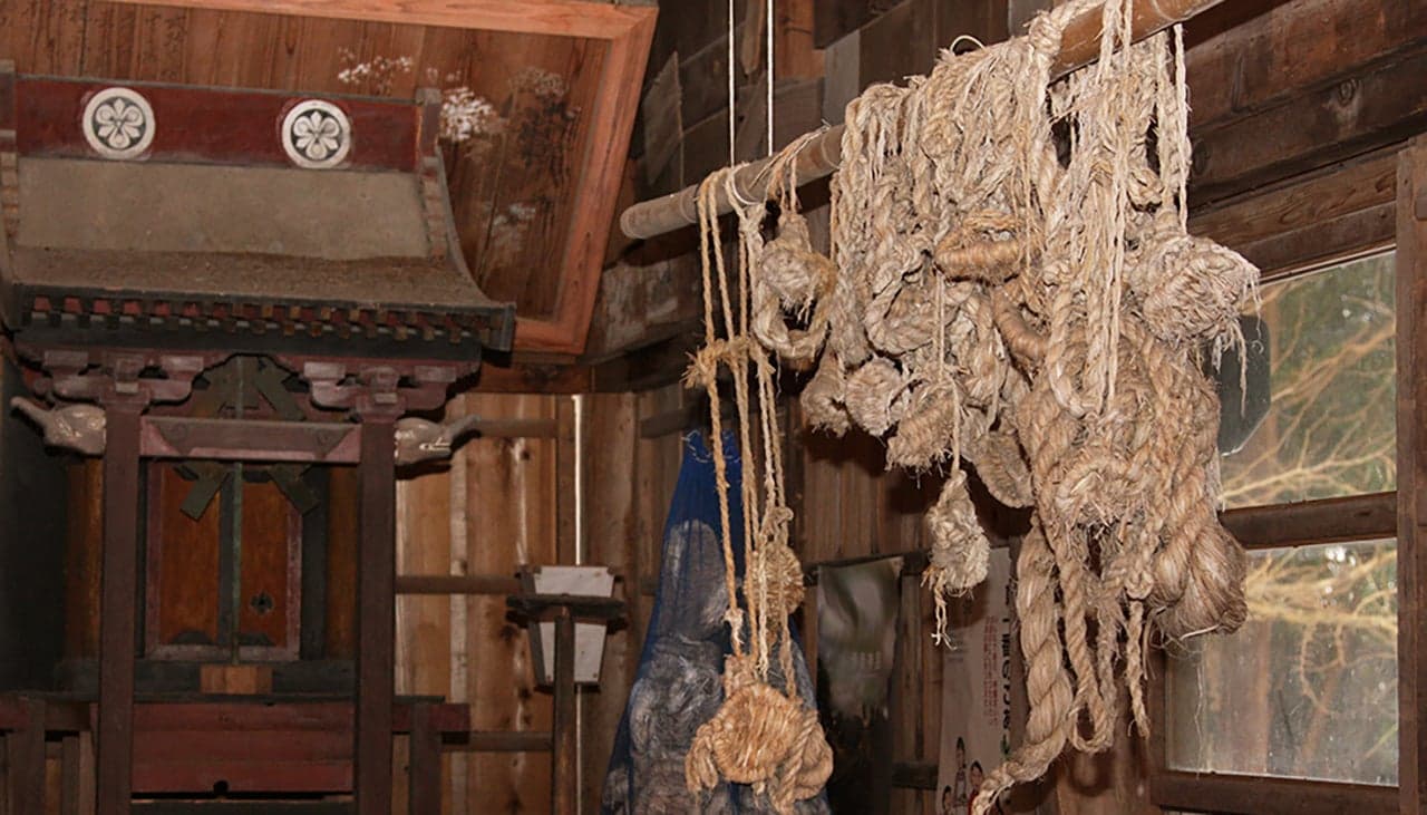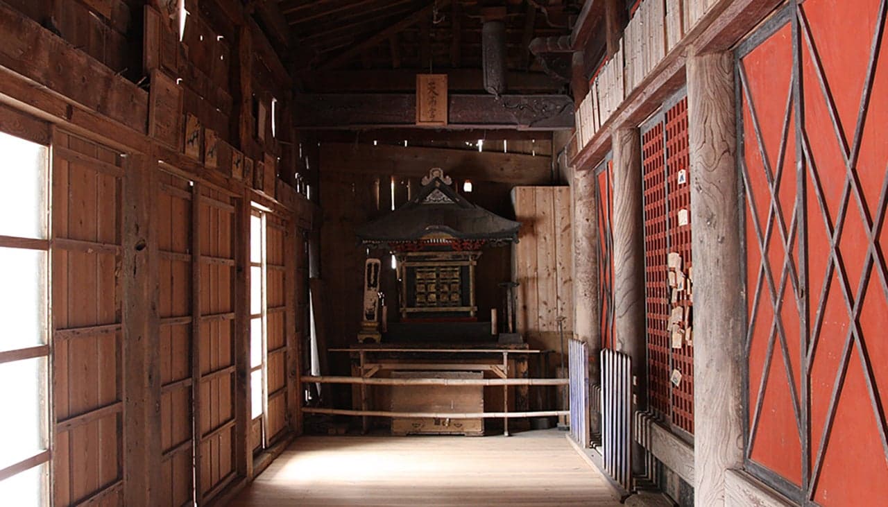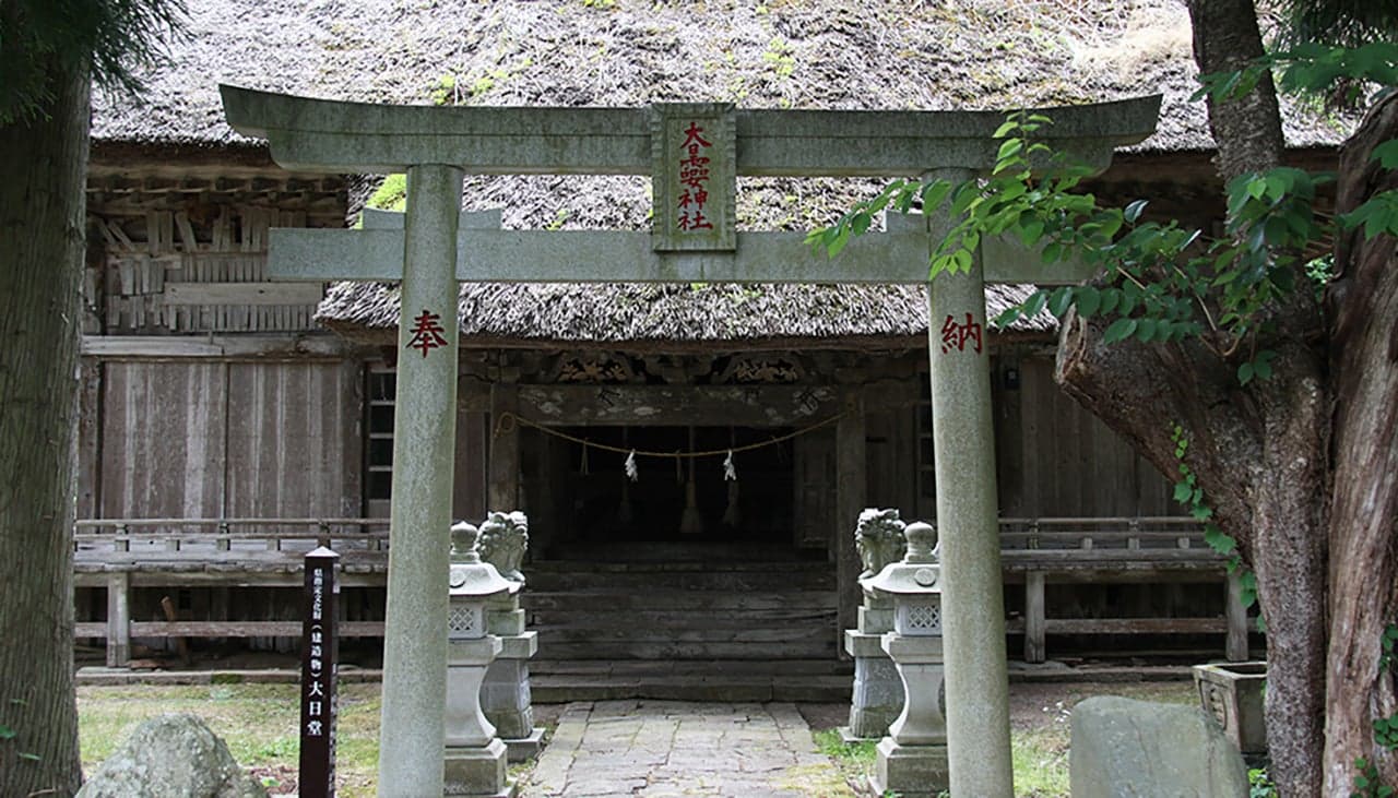 1490年の創建とされる「大日霊(おおひるめ)神社」の拝殿。現在の建物(県の有形文化財)は1718年の再建と伝わります。堂内には、木食清眼の作とされる「大日如来坐像」(市の有形文化財)を安置。牛の守護神として篤い信仰を集めており、古くは全島から牛飼い人が牛とともに徒歩で訪れました。“牛の絵馬”“牛のわらじ”が多数奉納されています。
