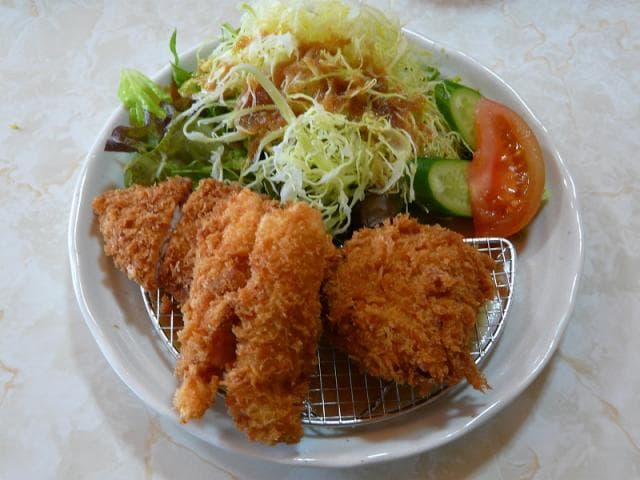 地元のマグロ漁船が水揚げしたマグロのトロ部分を使用した「まぐろトロカツ」、鹿児島県産赤鶏の胸肉を海洋深層水に付け込んだものを使った「赤鶏チキンカツ」、地元産六白黒豚を使用した「黒豚メンチカツ」の三種類のカツが一度に味わえ、ボリューム満点。是非、食べて試合にカツ、恋愛にカツなどの験を担ごう!