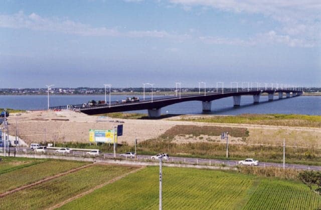 利根かもめ大橋は、利根川の河口手前に架かる橋であり、千葉県銚子市と茨城県神栖市を結んでいます。延長1,650m(橋梁部1,145m)で「人と自然にふれあう躍動感のある橋」をテーマにカモメの羽ばたきをイメージし、デザインされました。