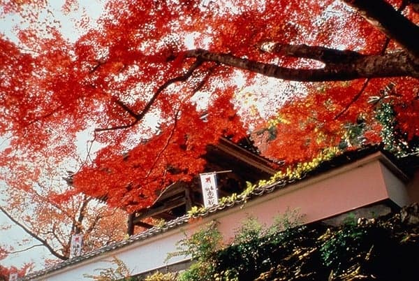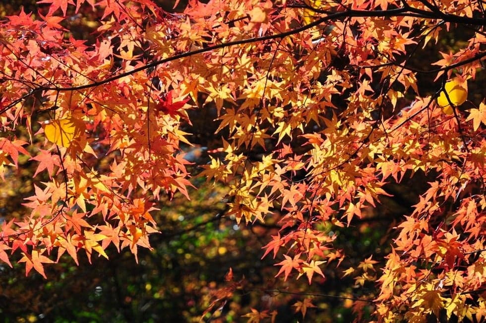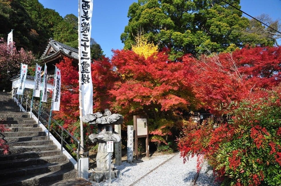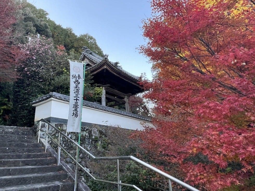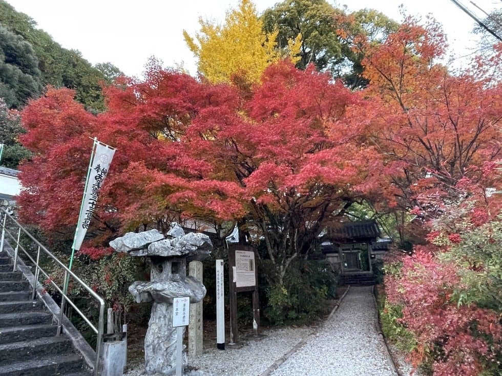 境内には樹齢300年をこえる大クスノキがあり、秋には本堂に向かう石段から北側を眺めると、大クスノキの緑、モミジの赤、イチョウの黄のコントラストが美しく、紅葉景勝地として飛騨・美濃紅葉33選にも選ばれています。例年、11月上旬頃から色付き始め、11月中旬~12月上旬頃にかけて見頃になります。