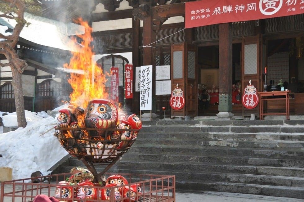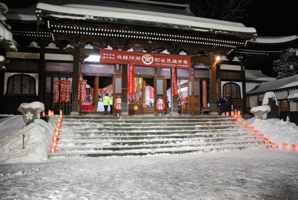 補陀山洞雲寺(ほださんとううんじ)は、応永年間(室町時代)に開創されたといわれる曹洞宗のお寺です。近年は、「達磨のお寺」として親しまれ境内には3,000点を越える様々な達磨を収蔵する達磨堂があるほか、奥の院の観音山の中腹には、かつて洞雲寺第20代住職大潤宗潭(だいじゅんそうたん)氏に随待して神岡に滞在した際、町の人々に多くの絵や書を残し、後に永平寺副貫主をつとめられた高僧、浩潤球学(こうじゅんきゅうがく)氏が描いた達磨図をモデルとして昭和48年(1973年)に建立された高さ8.9メートルの巨大な立ち姿の達磨像「立ち達磨」があり高台から神岡の町を見下ろします。また、境内の金毘羅堂には金毘羅大権現、秋葉大権現が祀られており、毎年2月下旬に開催される神岡初金毘羅宵祭では町内の有志団体が製作した様々な趣向を凝らした創作山車の行列が四国の金刀比羅宮でいただいたお札を先頭に金毘羅堂をめざして神岡の街中を練り歩きます。